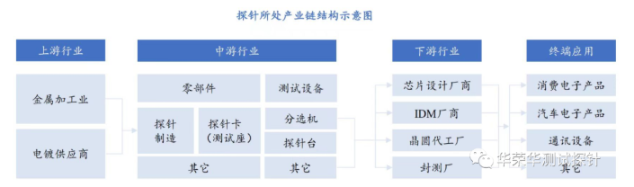 探針作為半導體產(chǎn)品測試的關(guān)鍵部件,處于半導體產(chǎn)業(yè)鏈中游的測試設(shè)備及其零部件制造行業(yè),探針行業(yè)的上游為金屬加工,電鍍行業(yè),下游為芯片設(shè)計、晶圓制造及晶圓代工、封裝與測試行業(yè),經(jīng)測試達到設(shè)計規(guī)范要求的半導體產(chǎn)品最終應(yīng)用與消費電子、汽車電子、通訊設(shè)備等眾多領(lǐng)域。