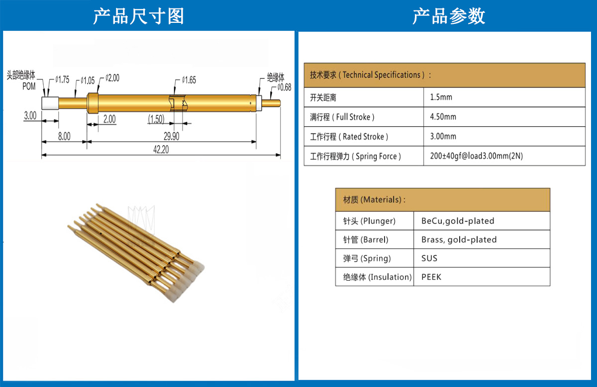 產(chǎn)品簡介:KGZ165探針、1.65mm測(cè)試針、總長42.20mm、彈簧針、測(cè)試針