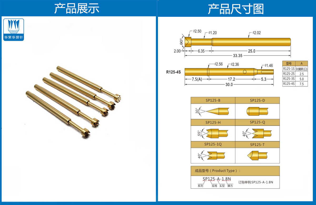 產(chǎn)品簡介:SP125探針、2.02mm測試針、總長33.35mm、彈簧針、測試針、探針